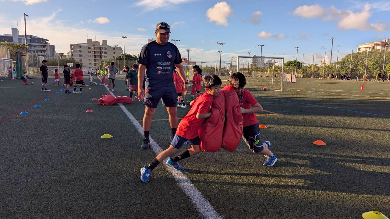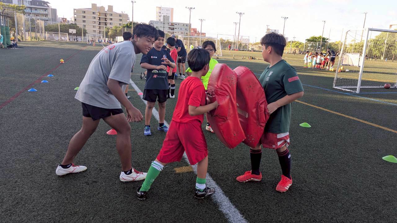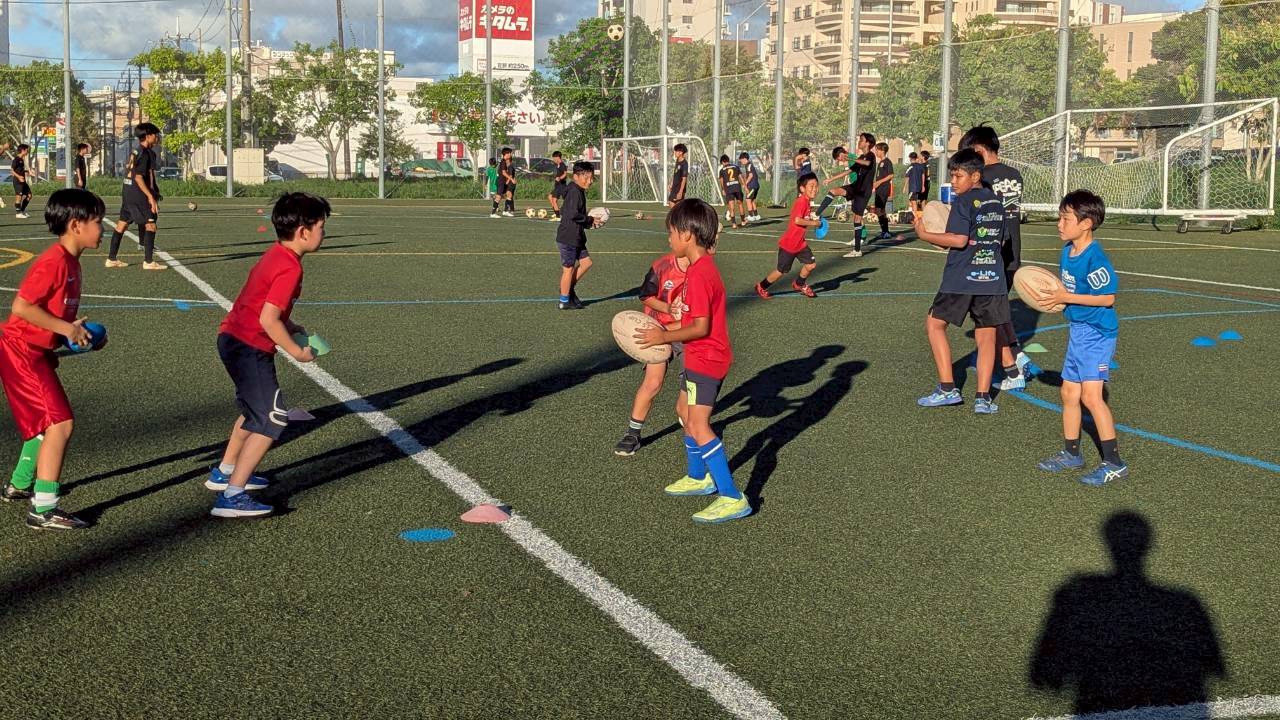 グランフォルティス沖縄のスクール生にとっては、ラグビーをはじめてプレーする子も多く、ラグビー特有の
